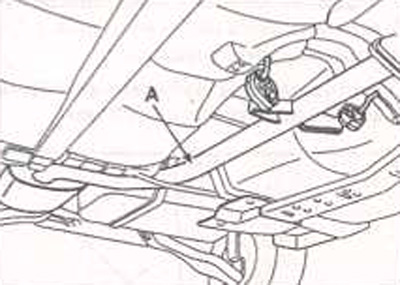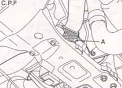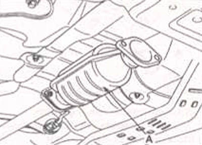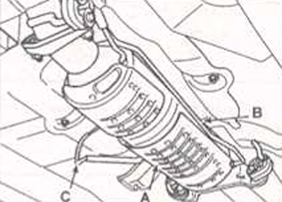 - 1) На автомобиле с угольным (сажевым) фильтром системы выпуска отработавших газов (CPF) (А), отсоедините шланги (В), снимите датчик температуры (С), затем снимите каталитический нейтрализатор с угольным фильтром.
