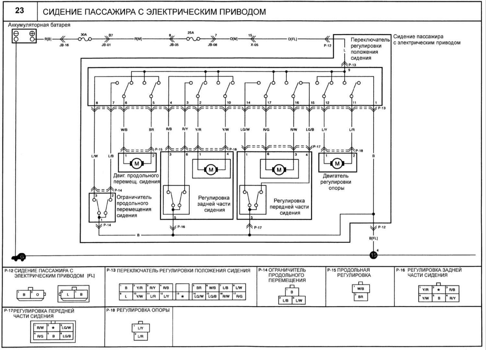 Статья о ремонте южнокорейских автомобилей Киа Оптима 1 (2000-2005): Электросхема сиденья пассажира с электрическим приводом: http://www.kmanual.net/Optima/MS/electrics/schemes/elektroshema-sidenya-passazhira-s-elektricheskim-privodom