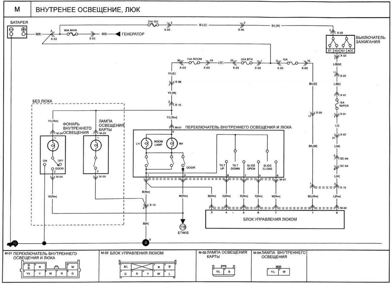 Статья о ремонте южнокорейских автомобилей Киа Рио 1 (2000-2005): Электросхема внутреннего освещения и люка: http://www.kmanual.net/Rio/DC/electrics/schemes/elektroshema-vnutrennego-osvescheniya-i-lyuka