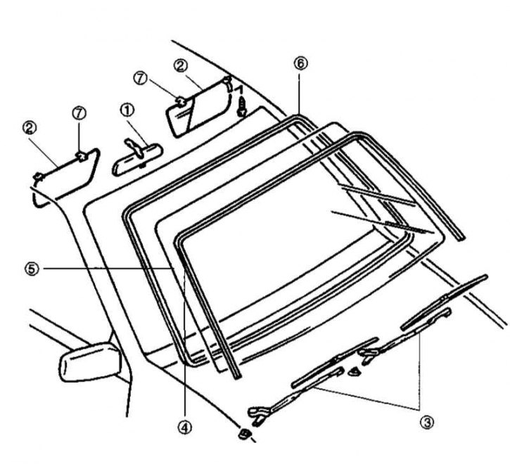 1 - Салонное зеркало заднего вида; 2 - Солнцезащитные козырьки; 3 - Стеклоочистители; 4 - Молдинг; 5 - Ветровое стекло; 6 - Направляющая стекла; 7 - Фиксаторы козырьков