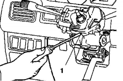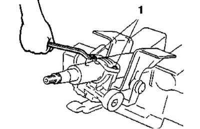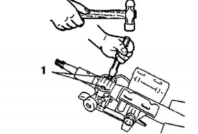 15. Зубилом пробейте шлицы в срезных головках крепежных болтов и, ввернув последние отверткой, снимите сборку замка блокировки рулевого вала.