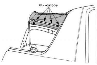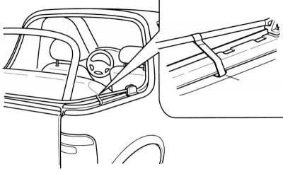 5. Опустите диагональную стойку и зафиксируйте их в сложенном положении, заправив пластмассовые крепежные скобы в пазы держателей панели в бортах автомобиля.