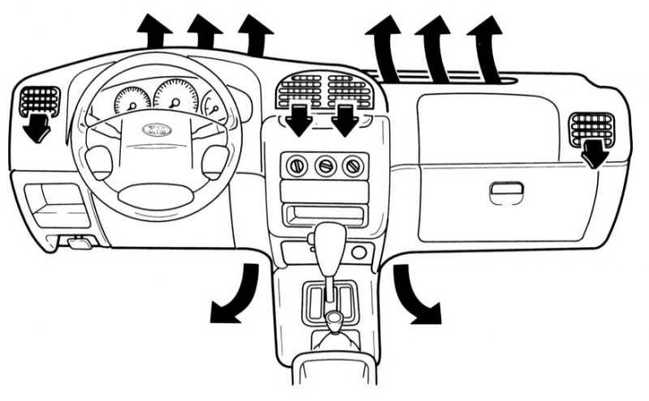 1. Запустите двигатель и активируйте К/В с консольного кнопочного выключателя (см. Раздел Органы управления и оборудование салона). Поверните рукоятку выбора направления раздачи в положение