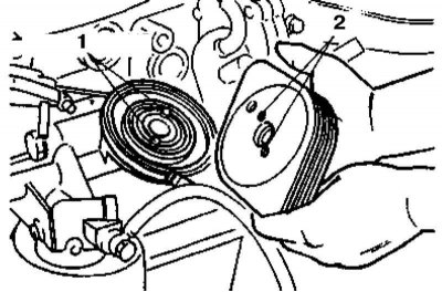 Проследите за попаданием выступов (1) на корпусе масляного фильтра в отверстия (2) в теплообменнике маслоохладителя.