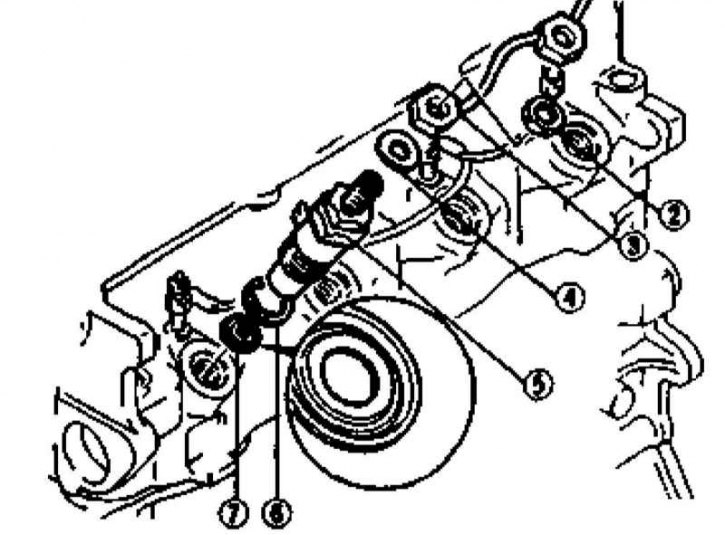 1 - Стопорная гайка возвратной линии; 3 - Возвратная трубка; 4 - Шайба; 5 - Форсунка; 6 - Уплотнительный элемент; 7 - Рифленая уплотнительная шайба