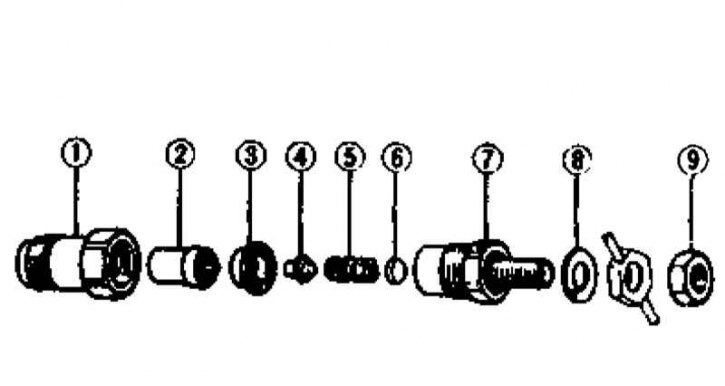 1 - Корпус форсунки; 2 - Корпус игольчатого клапана; 3 - Дистанционная втулка; 4 - Нажимной палец; 5 - Нажимная пружина; 6 - Регулировочная шайба; 7 - Держатель; 8 - Шайба; 9 - Гайка