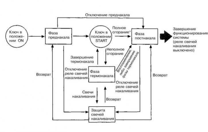 В фазе термонакала используется остаточное тепло нагревательных элементов свечей после возврата ключа из положения START в положение OFF при неудачной попытке запуска двигателя до завершения фазы преднакала, когда свечное реле активировано.