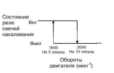 Примечание. При опускании напряжения ниже 14 В более чем на две секунды реле вновь активируется. Кроме того, отключение свечей производится при отказе собственно реле, а также датчиков ECT, CMP и положения педали газа.