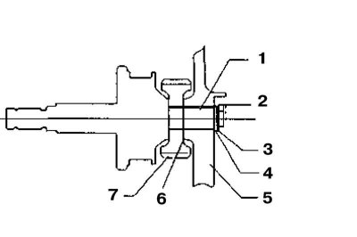 1 - Вал шестерни 2 - Осевой люфт 3 - Стопорное кольцо 4 - Шайба 5 - Кронштейн шайбы 6 - Регулировочная шайба 7 - Редукционная шестерня