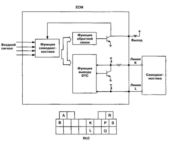 А - Очистка памяти процессора; В - Батарея; К - Коммуникационная клемма; L - Коммуникационная клемма; Р - Клемма вывода кодов; Q - Клемма диагностики двигателя; R - Клемма заземления; S - Клемма заземления