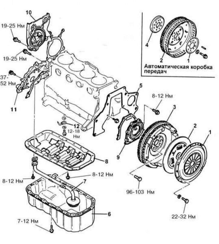 1 - Корзина сцепления (РКПП)/гидротрансформатор (АТ); 2 - Ведомый диск сцепления (РКПП); 3 - Маховик/приводной диск; 4 - Планшайба (АТ); 5 - Задняя пластина; 6 - Поддон картера; 7 - Маслозаборник; 8 - Маслоотражатель; 9 - Задняя крышка с сальником коленчатого вала; 10 - Водяной насос; 11 - Масляный насос с передним сальником коленчатого вала; 12 - Маслораспылитель