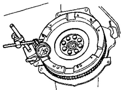 4. Временно закрепите маховик/приводной диск на коленчатому валу и при помощи измерителя DTI определите величину его поперечного биения. Если результат измерения превышает величину 0.2 мм, маховик/приводной диск следует отдать в проточку, либо заменить, - предельная допустимая глубина проточки составляет 0.5 мм.