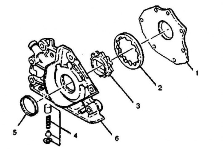 1 - Крышка; 2 - Наружный ротор; 3 - Внутренний ротор; 4 - Сборка редукционного клапана; 5 - Сальник; 6 - Корпус