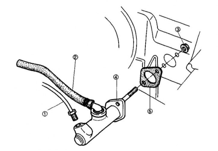 1 - Линия гидравлического тракта; 2 - Шланг от резервуара ГТЦ; 3 - Гайка; 4 - Главный цилиндр; 5 - Уплотнительная прокладка