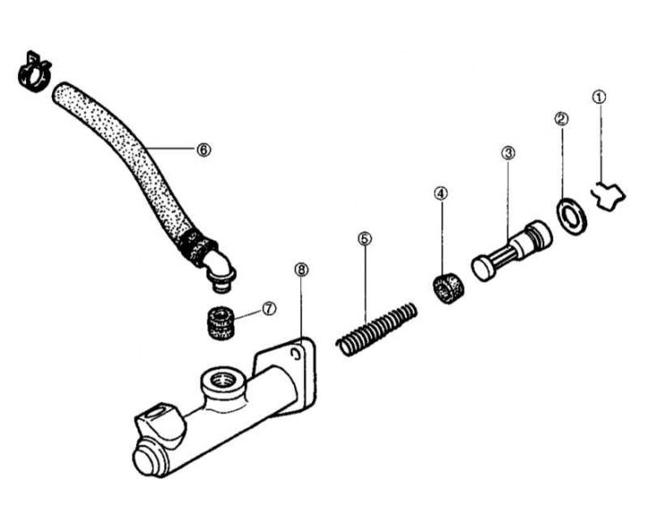 1 - Фиксатор (стопорное кольцо); 2 - Упорная шайба поршня; 3 - Сборка поршня со вторичной чашкой; 4 - Первичная чашка; 5 - Возвратная пружина; 6 - Шланг к резервуару; 7 - Посадочная втулка; 8 - Корпус главного цилиндра