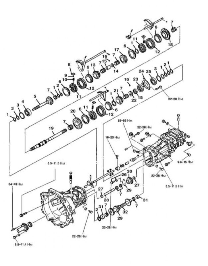 1 - Стопорное кольцо; 2 - Упорная шайба; 3 - Регулировочное кольцо; 4 - Передний подшипник; 5 - Сборка первичного (входного) вала; 6 - Блокирующее кольцо синхронизатора; 7 - Игольчатый подшипник; 8 - Сухарь; 9 - Шариковый фиксатор; 10 - Пружина синхронизатора; 11 - Ступица скользящей муфты; 12 - Скользящая муфта синхронизатора; 13 - Шестерня 3-й передачи; 14 - Дистанционная шайба; 15 - Внутренняя обойма; 16 - Ролик; 17 - Шестерня 2-й передачи; 18 - Шестерня 1-й передачи; 19 - Вторичный (главный) вал; 20 - Шестерня задней передачи; 21 - Шестерня 5-й передачи; 22 - Регулировочная гайка; 23 - Фиксирующее кольцо; 24 - Упорная пластина; 25 - Задний подшипник; 26 - Болт с шайбой; 27 - Держатель; 28 - Промежуточный вал задней передачи; 29 - Стопорная пластина; 30 - Промежуточная шестерня задней передачи; 31 - Наружная обойма; 32 - Сборка контрприводного вала