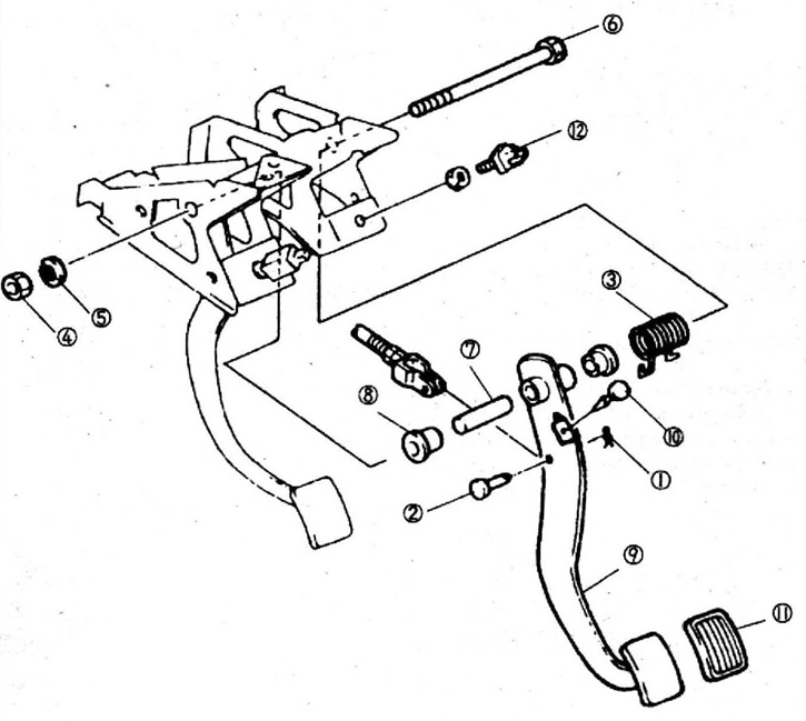 7. При необходимости снимите втулки, накладку и резиновый ограничитель (буфер) педали тормоза.