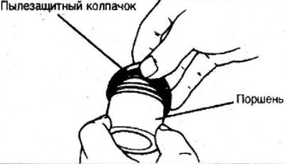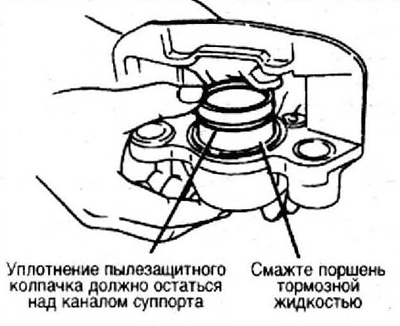 2. Смажьте поршень тормозной жидкостью и частично вставьте его в полость суппорта. Канавка для пылезащитного кольца должна остаться над полостью суппорта.