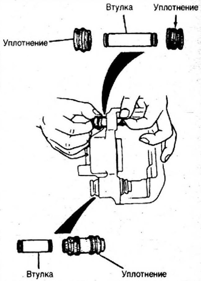 7. Установите втулки суппорта с новыми уплотнениями.