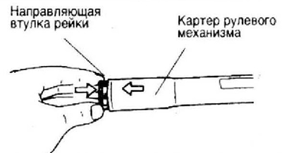 4. Смажьте направляющую втулку рейки и установите ее в правый торец картера рулевого механизма.