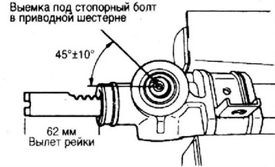7. Нанесите смазку на верхний подшипник и зубья приводной шестерни. Установите ее так, чтобы выемка под стопорный болт располагалась под углом, указанным на рисунке, когда рейка будет находиться в среднем положении.
