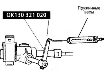 19. Измерьте момент на приводной шестерне рулевого механизма при помощи специального приспособления и пружинных весов.