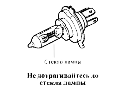 Предостережение! Галогенная лампа содержит газ под давлением. Если она взрывается при разбивании, то разлетаются стеклянные осколки, которые могут стать причиной травм. Если к стеклу лампы прикасаться голыми руками, то жировые пятна, оставленные на нем, могут вызвать перегрев и взрыв лампы при ее включении. Никогда не трогайте стекло галогенной лампы голыми руками. Храните галогенные лампы в местах, недоступных детям. При работе с галогенной лампой или вблизи нее пользуйтесь защитными очками.