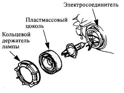 4. Снимите кольцевой держатель, повернув его против часовой стрелки (глядя по ходу автомобиля) примерно на одну восьмую оборота,чтобы он вышел из цоколя. Выкрутите его из пластикового цоколя, который пригодится Вам для другой лампы.