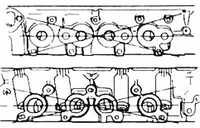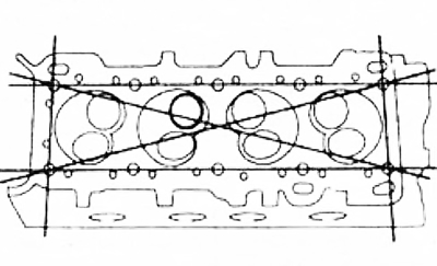 2. С помощью плоскопараллельного бруса и щупов проверьте отсутствие коробления головки блока цилиндров в шести направлениях, показанных на рисунке.