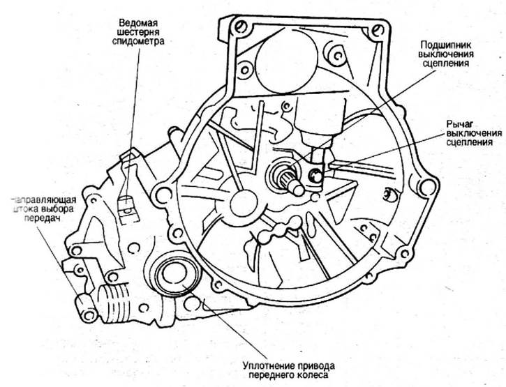 Коробка передач расположена в моторном отсеке поперечно таким образом, что картер сцепления обращен к правой стороне автомобиля.