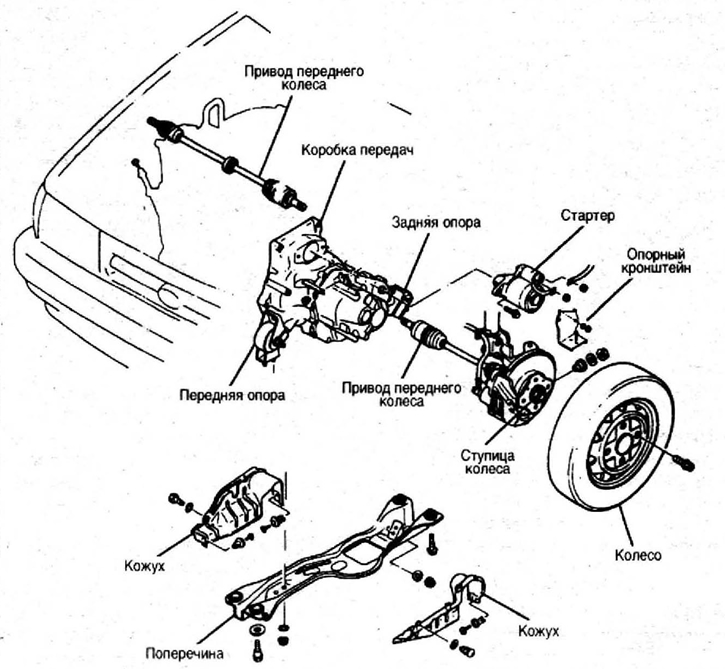 Коробка передач установлена на двух резиновых опорах, которые закреплены на поперечине. Эти элементы служат также в качестве задних опор двигателя.