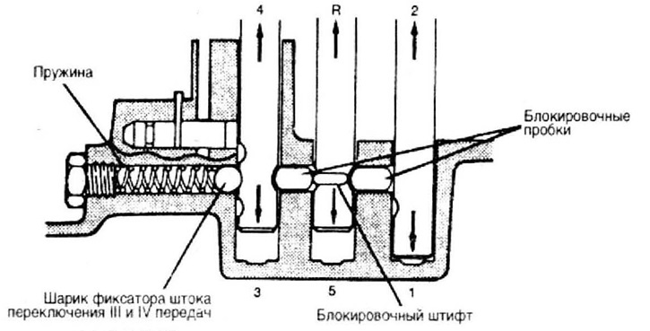 Механизм блокировки переключения имеет две пробки и штифт. Пробки установлены по обе стороны штока переключения пятой передачи и передачи заднего хода. Блокировочный штифт установлен в штоке переключения V передачи и передачи заднего хода и таким образом, что находится в контакте с концами блокировочных пробок.