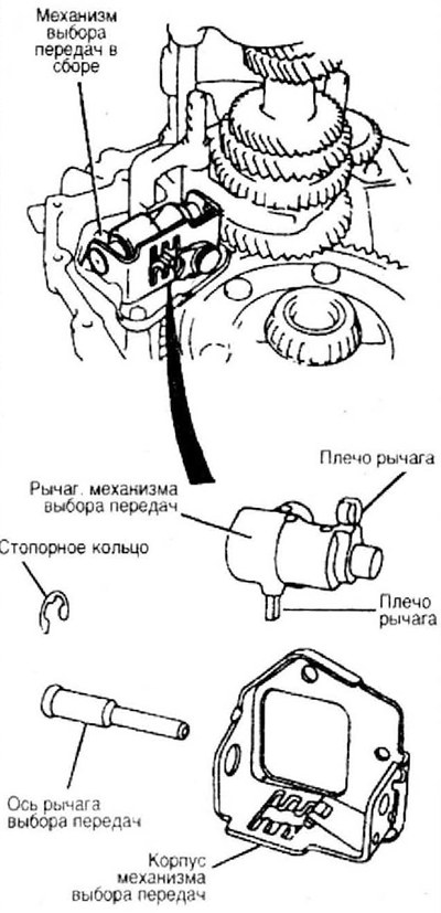 Механизм выбора передач выполнен в виде отдельного узла. В его корпусе на оси установлен рычаг выбора передач, который связан с тремя штоками, на которых смонтировано такое же количество вилок включения передач.