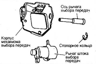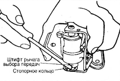 1. Снимите стопорное кольцо с оси рычага механизма выбора передач.