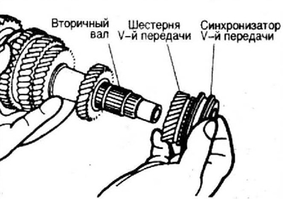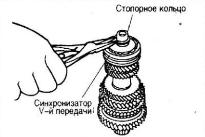 4. Снимите стопорное кольцо и стопорную шайбу синхронизатора V передачи.