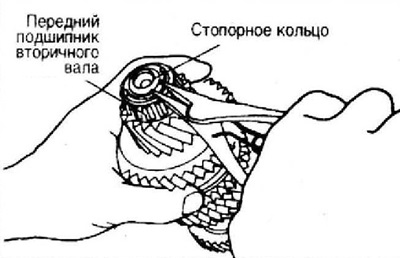 6. Снимите стопорное кольцо подшипника с вала со стороны ведущей шестерни главной передачи.