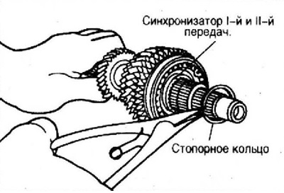 8 Снимите блокировочное кольцо с синхронизатора I и II передач.