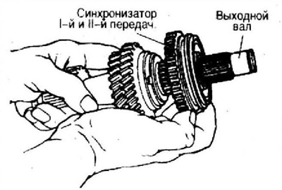 10. Снимите синхронизатор I и II передач. Если усилие снятия синхронизатора с вала слишком велико, можно использовать съемник шкивов или аналогичное приспособление.