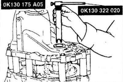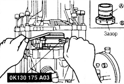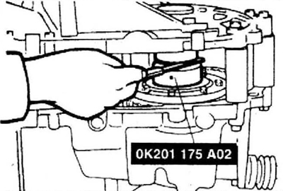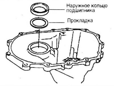 16. Установите в картер коробки передач выбранную прокладку и наружное кольцо подшипника.