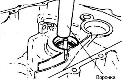 7. Установите в картер сцепления воронку и наружное кольцо подшипника вторичного вала.