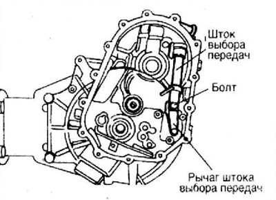 4. Отверните болт, а затем снимите шток выбора передач и тягу привода переключения передач.
