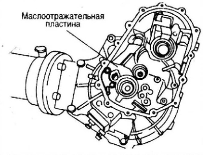 6. Отверните два болта, а затем снимите маслоотражательную пластину и прокладку.