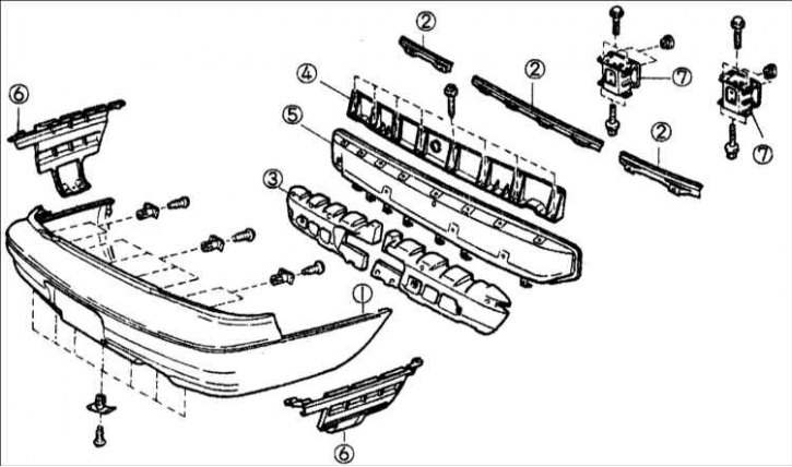 1 – передняя часть бампера; 2 – верхний кронштейн бампера; 3 – поглотитель энергии из вспененного материала; 4 – арматура и пластина; 5 – арматура; 6 – боковая пластина бампера; 7 – кронштейн бампера.