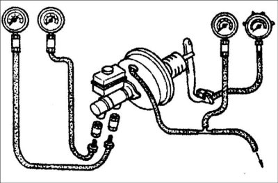 Подключите манометр, измеритель вакуума и измеритель силы давления на педаль, как показано на рисунке. После удаления воздуха из манометра проведите тест в соответствии с 3 приведенными ниже пунктами.