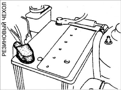 4. Проверьте, чтобы резиновый защитный чехол на положительной клемме полностью закрывал ее.