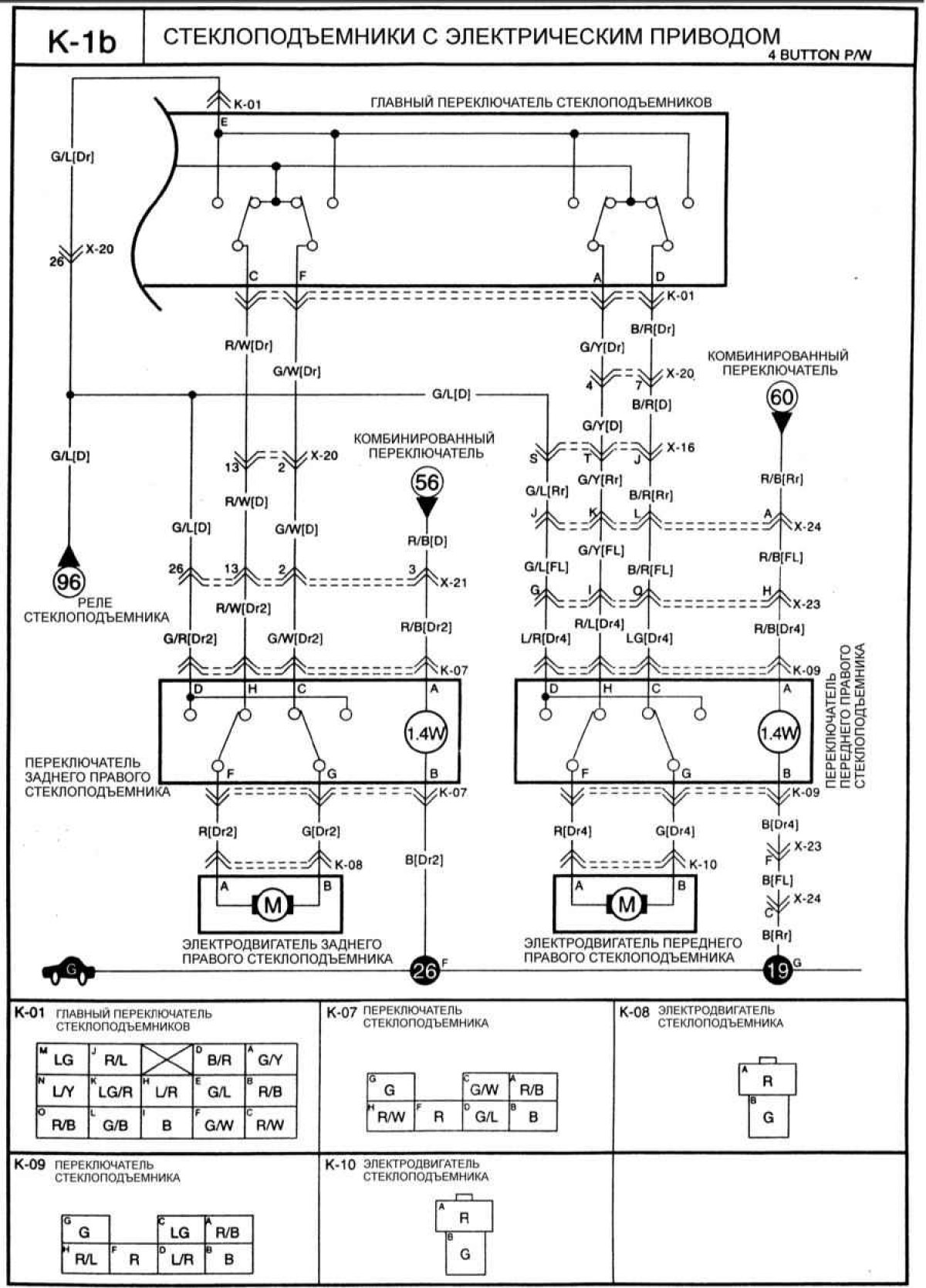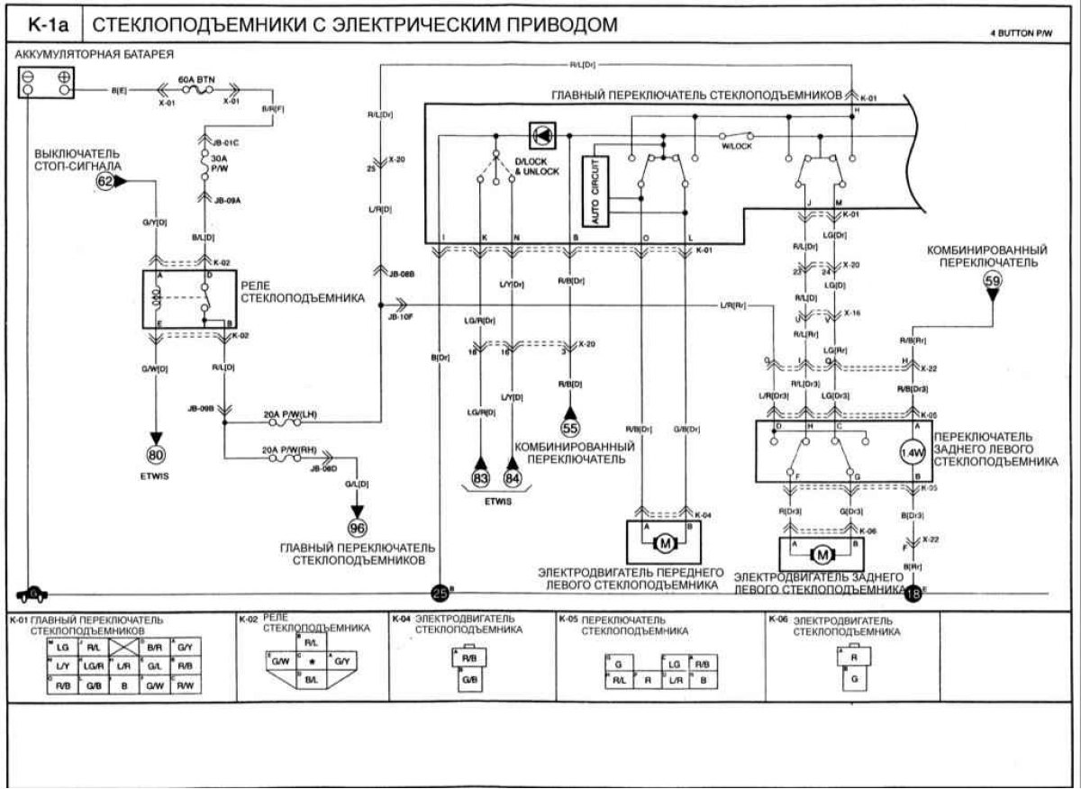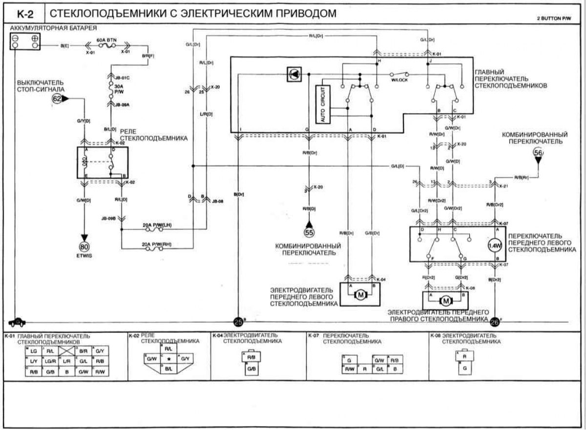 Статья о ремонте южнокорейских автомобилей Киа Кларус (1995-2001): Стеклоподъемники с электрическим приводом: http://www.kmanual.net/more/Clarus/electrics/schemes/steklopodemniki-s-elektricheskim-privodom