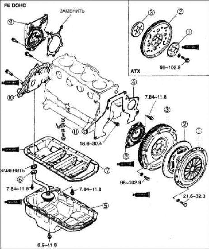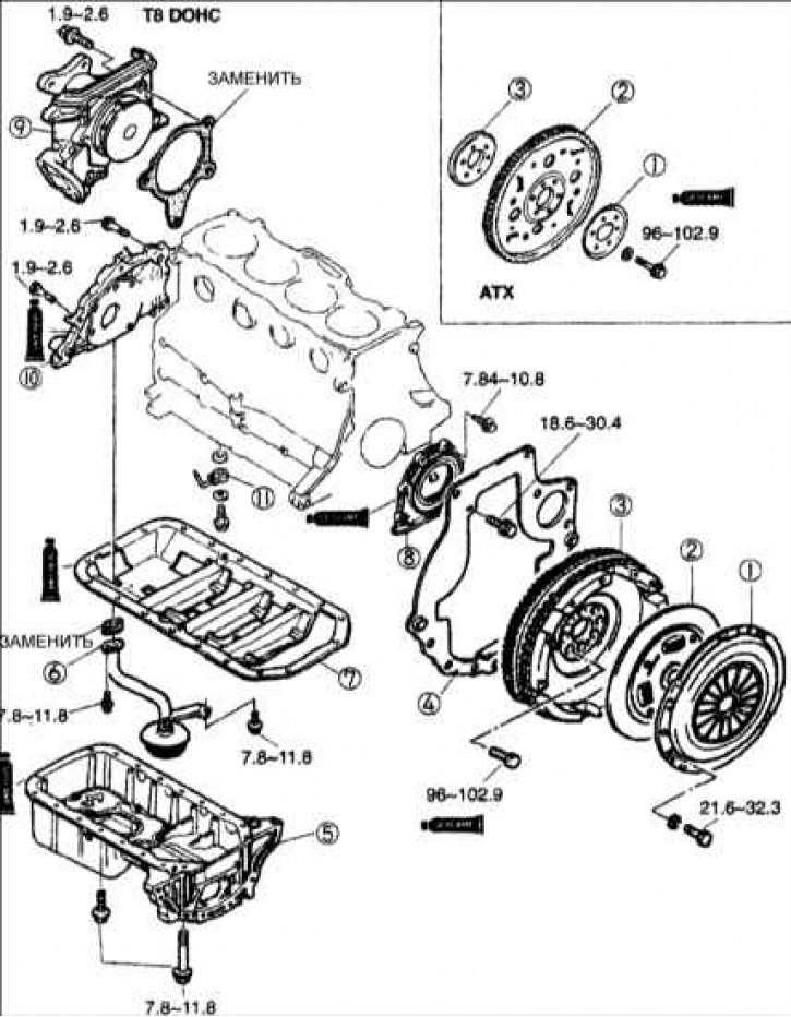1 – корзина сцепления (М/Т), опорная пластина (А/Т); 2 – ведомый диск сцепления (М/Т), ведущий диск (А/Т); 3 – маховик (М/Т), пластина (А/Т); 4 – переходная пластина; 5 – масляный поддон; 6 – маслоприемник; 7 – элемент жесткости; 8 – задняя крышка; 9 – водяной насос; 10 – передняя крышка с масляным насосом; 11 – распылитель масла.