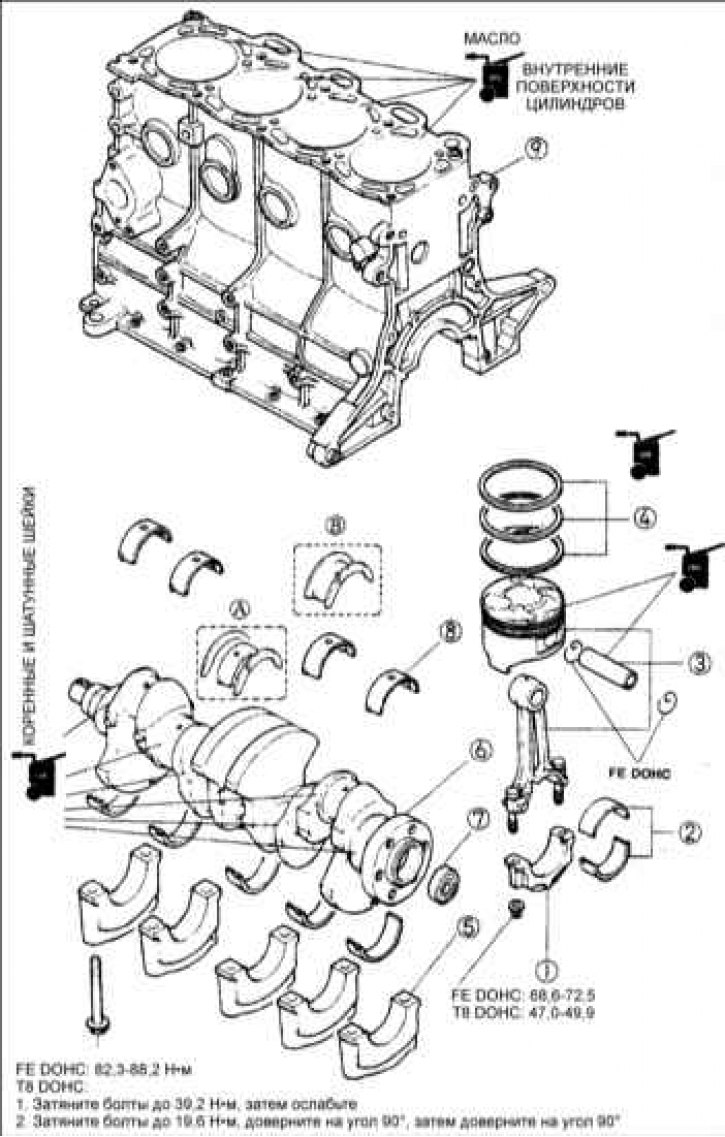 Приведено описание разборки и сборки блока цилиндров на двигателе, с которого предварительно сняты вспомогательные детали, зубчатый ремень, шкивы распределительных валов и головка цилиндров.