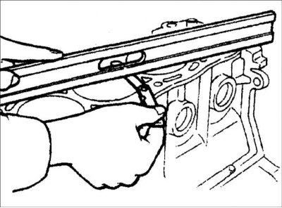 2. Металлической линейкой и щупом в шести направлениях проверьте плоскостность сопрягаемой поверхности блока цилиндров.