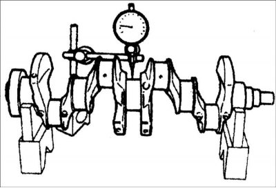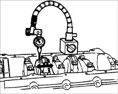 31. Переместите коленчатый вал вдоль оси до упора и установите шкалу индикатора часового типа на ноль.